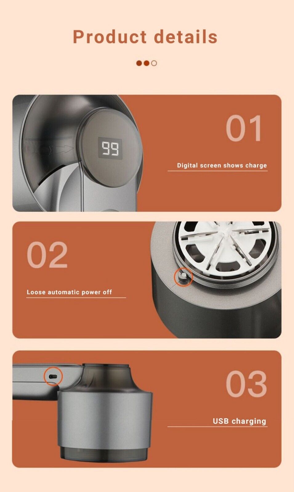 ✔ USB Charging (image inset) – Conveniently rechargeable via USB, making it eco-friendly and travel-ready without the need for disposable batteries.